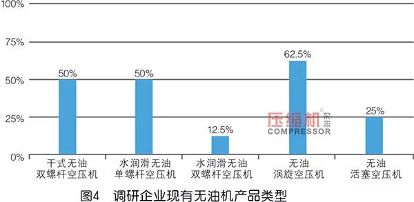 调研数据显示,涡旋空压机是无油机中占比最高的机型,62.5%的企业拥有无油涡旋空压机,干式无油双螺杆空压机与水润滑无油单螺杆空压机占比相同,无油活塞空压机次之,水润滑无油双螺杆空压机占比最低。反过来看,水润滑无油双螺杆的潜在增长空间相对更大一些,如图4。