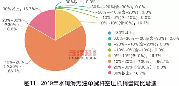 水润滑无油单螺杆空压机的增长分布较为稳定,企业主体增长在10%~20%区间,增长10%以内和增长30%以上的企业各占六分之一左右。这主要由于经过部分企业长期培育和宣传,水润滑无油单螺杆空压机的产品和市场比较稳定、成熟,用户对其优缺点的认识较为清晰,如图11。