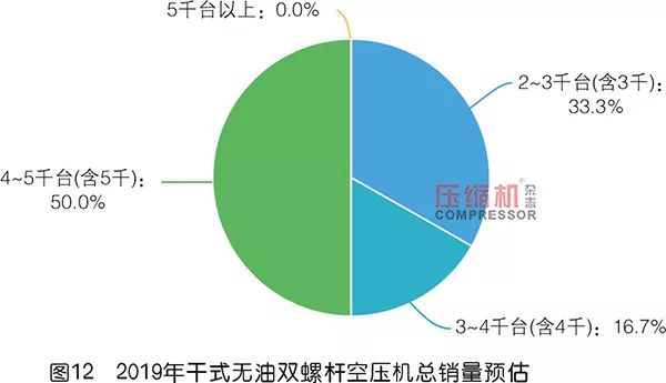 对于2019年干式无油润滑双螺杆空压机的总销量,一半的企业预计会达到4~5千台,给出2~3千台预估的企业占三分之一,另有约16.7%的企业认为销量在3~4千台。所以,今年干式无油润滑双螺杆空压机的销量大概率会落在4000台左右,预计增长率为30%左右,如图12。