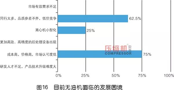 对目前无油机市场面临的发展困难或问题,75%的企业认为无油机成本高、价格高、市场认可度低,62.5%的企业认为同行太多,产品品质参差不齐,低价竞争盛行,而对市场需求和技术研发两方面基本无顾忌,如图16。这也说明,无油机行业有以下几点工作需要做:一是降低生产、研发成本,通过细分领域渗透、接近终端客户、技术培训和研讨会等形式,加强市场认可度培育;二是构建良性竞争市场环境,提升产品附加值,杜绝低价、低质、低水平竞争;三是加大技术研发力度,提升无油机的市场竞争力和性价比,在喷油螺杆、小型离心机应用领域拓展出更多市场空间。