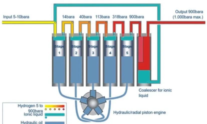 公开资料显示,林德公司采用离子液技术对氢气进行压缩,气体在气缸中随着离子液的上下运动所产生的容积变化而被压缩。其应用在35到70MPa氢燃料汽车加氢中。除了山东淄博能源加氢站,上海同济安亭的加气站采用的也是此种压缩机。